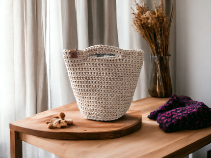 Perfect for work, going out or as a reusable market bag, this handmade crocheted tote bag measures 22cm at the bottom, 32cm wide at the top and 27cm tall.